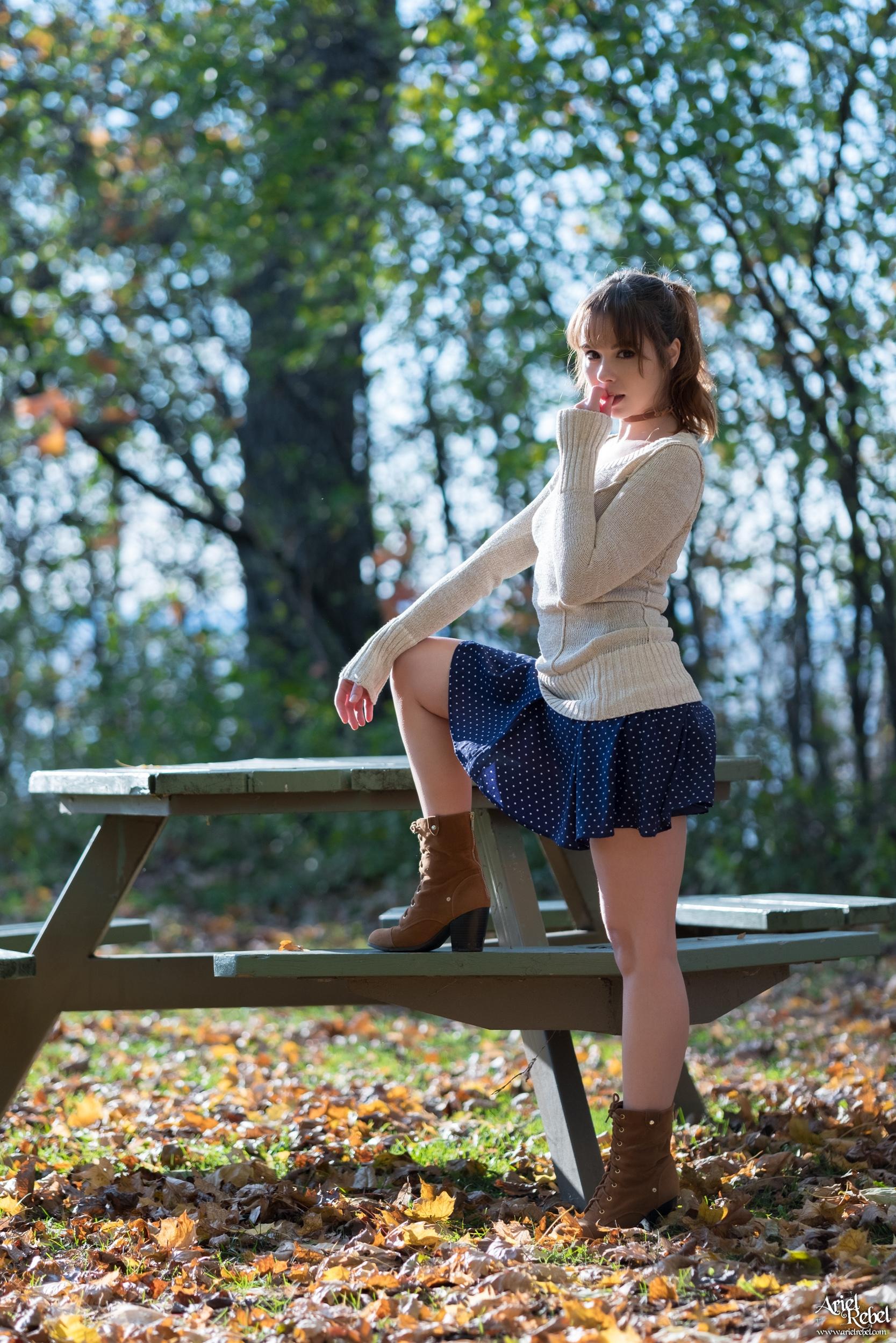 Девушка показывает пизду в парке на столе.