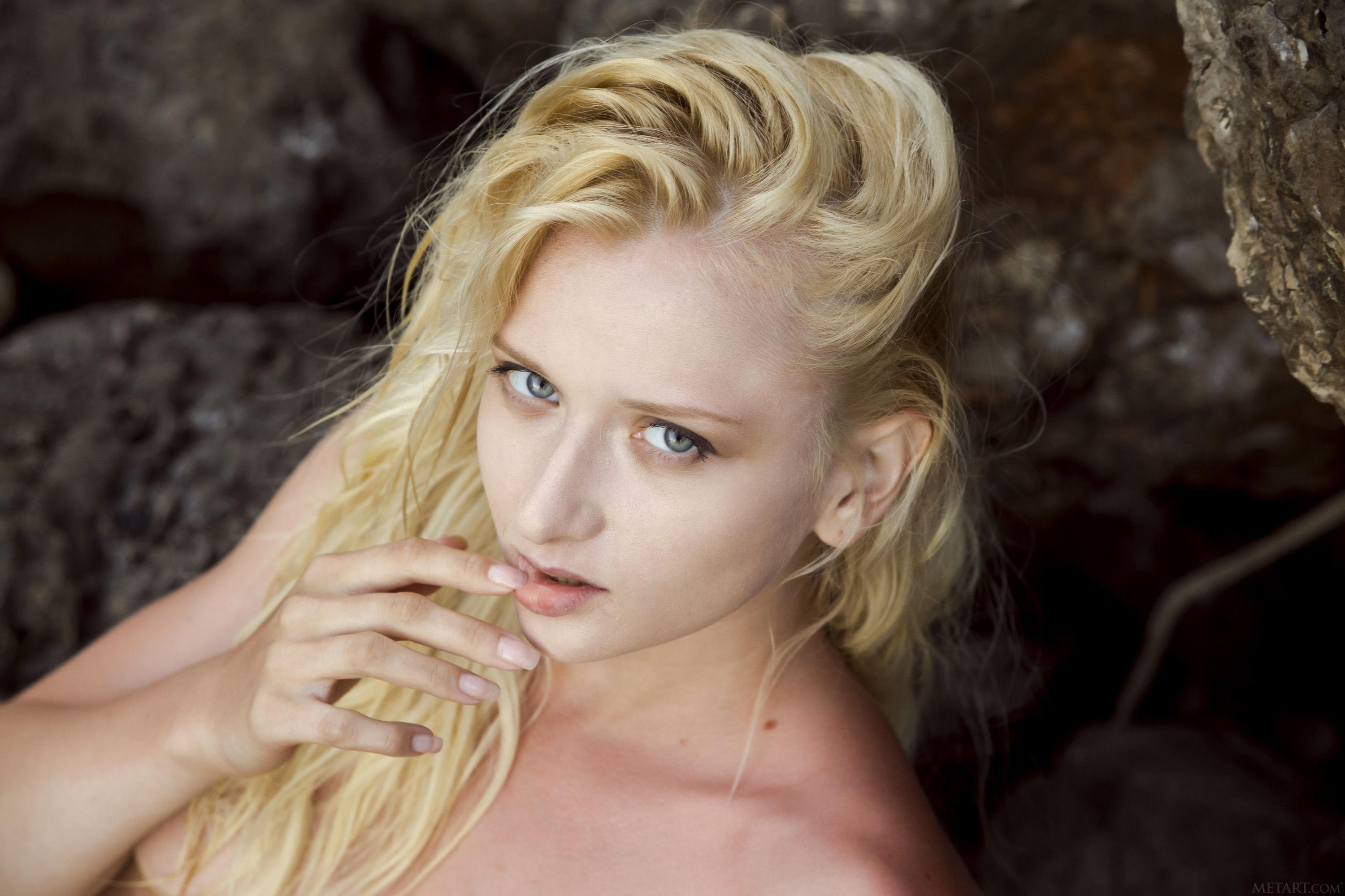 На фото голая блондинка раком исследует берег.