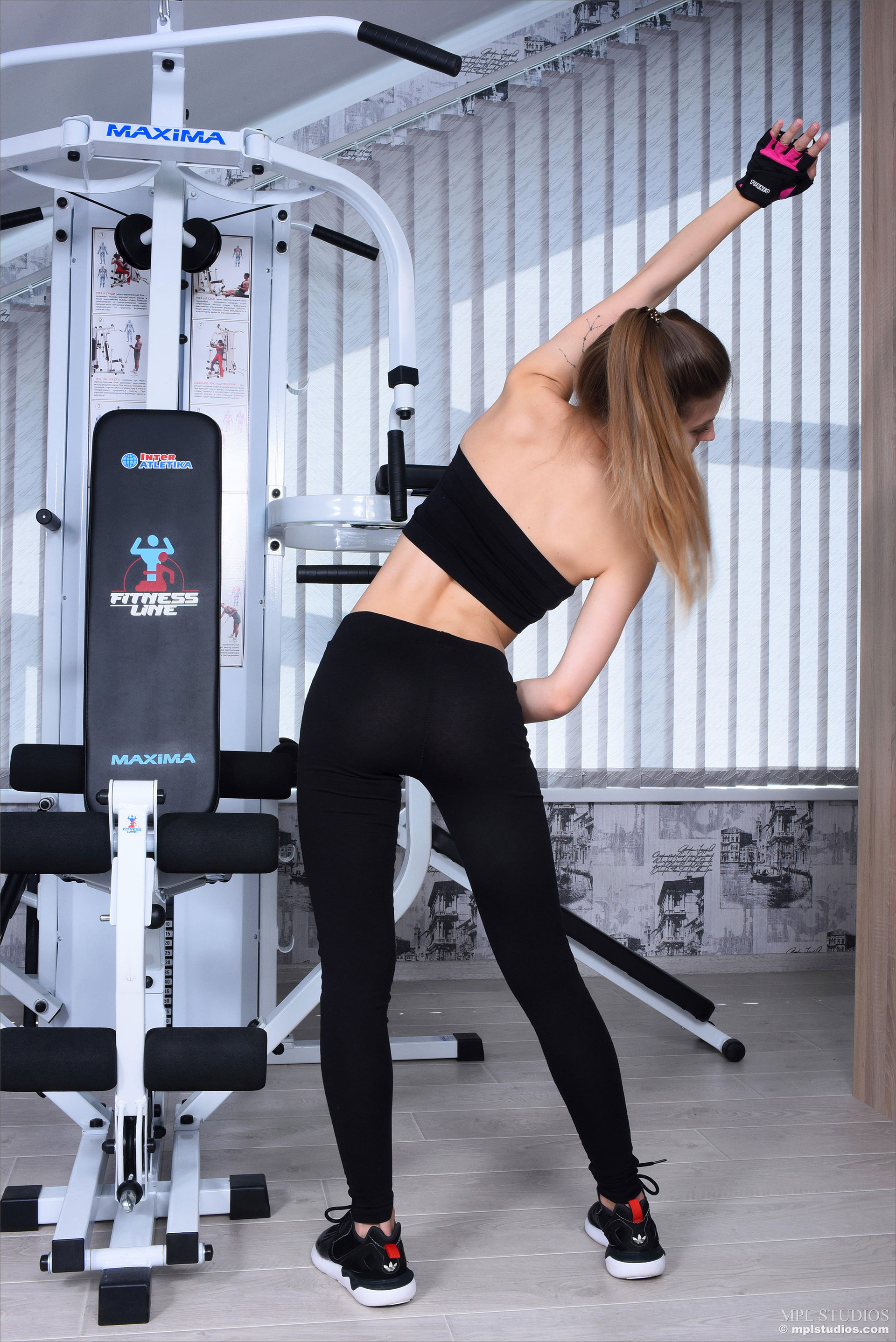 На фото голая спортивная девушка в тренажёрке.