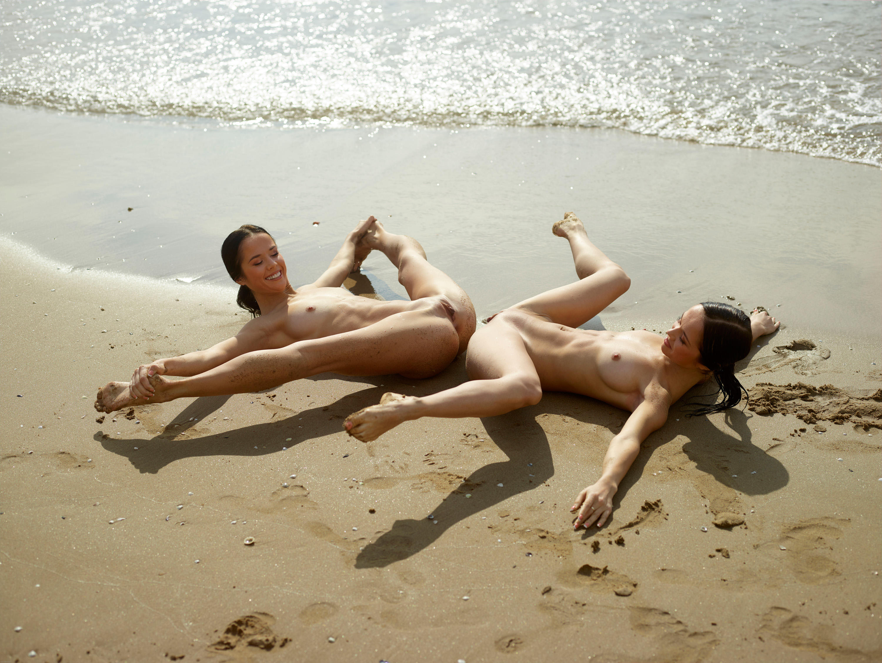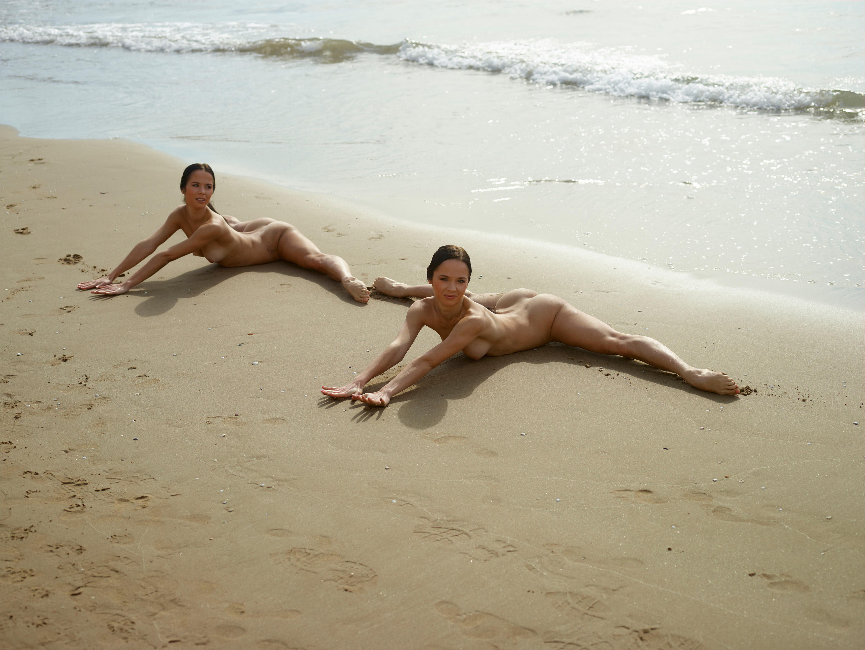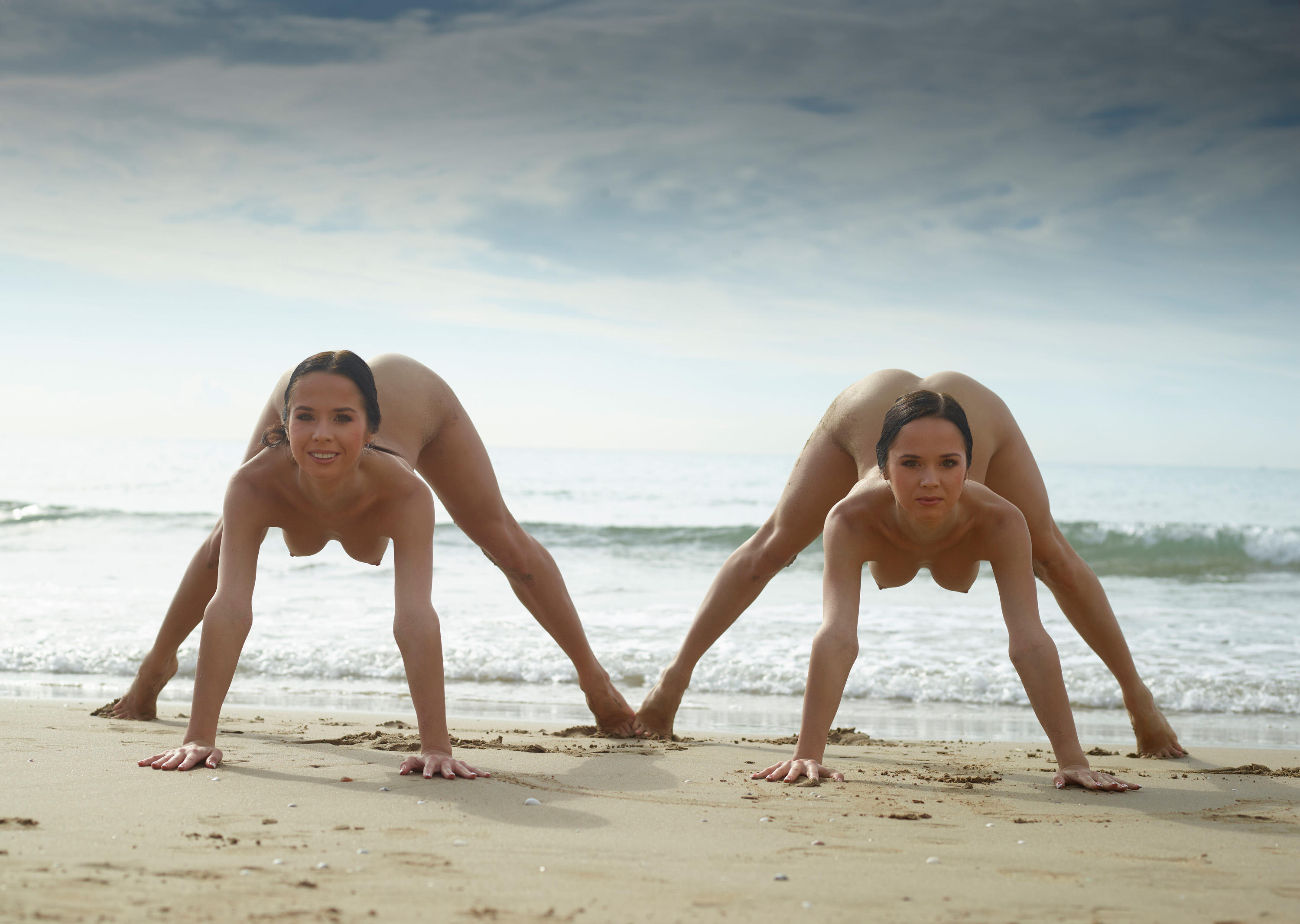 На фото голые гимнастки выполняют разминку.