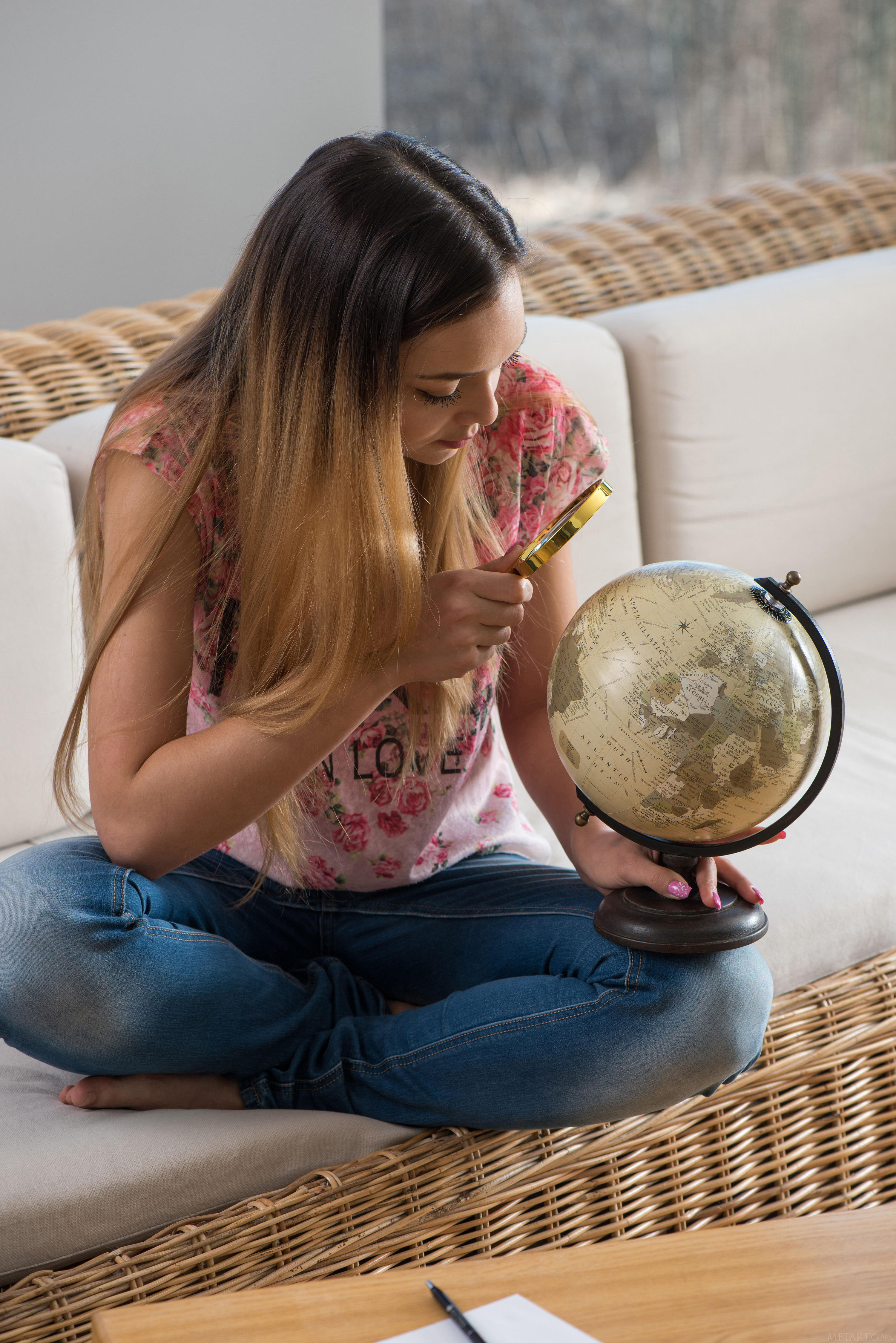 На фото юная попка изучает глобус.