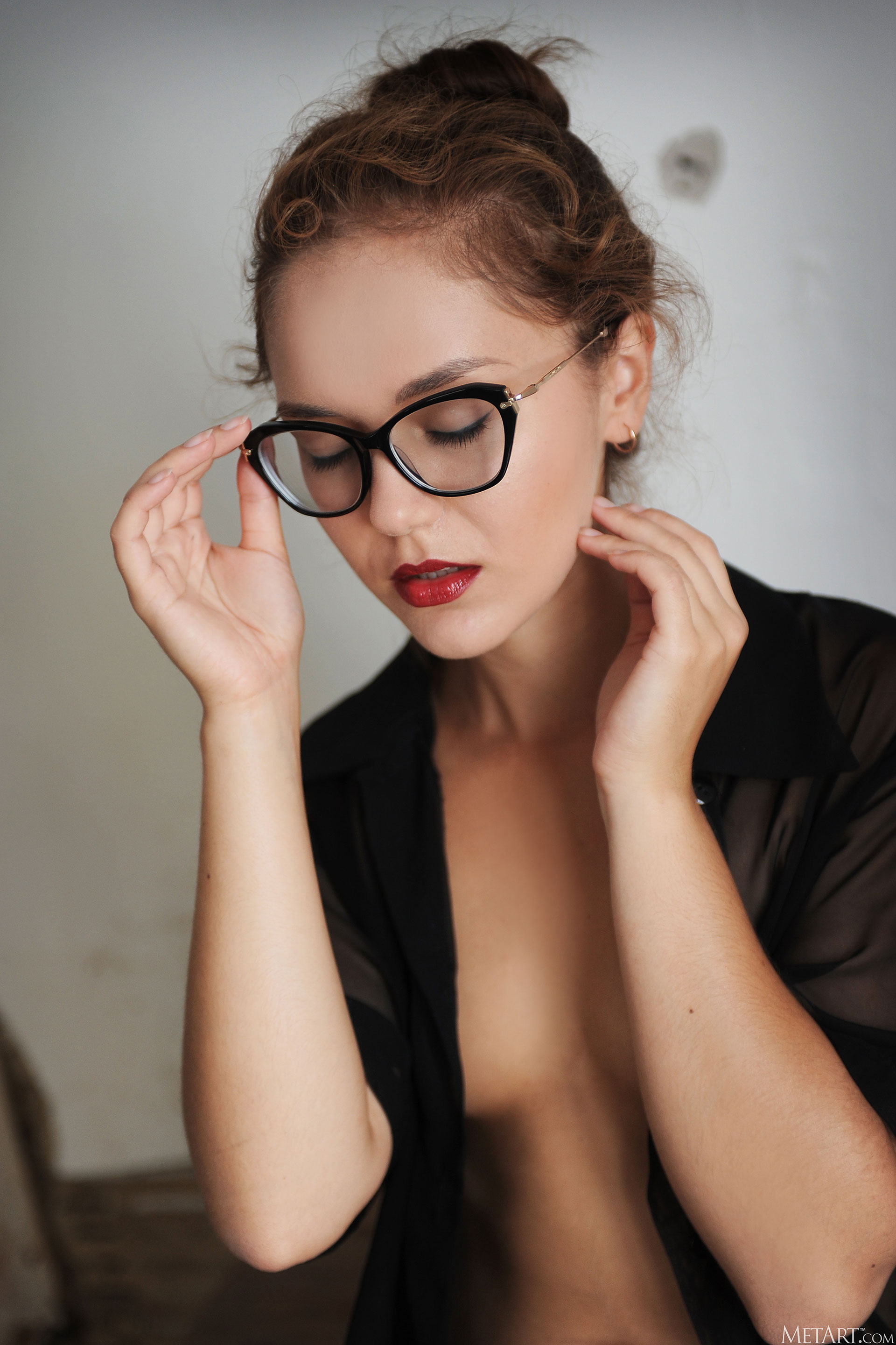 Эротические фото красивой девушки в очках с чупсом.