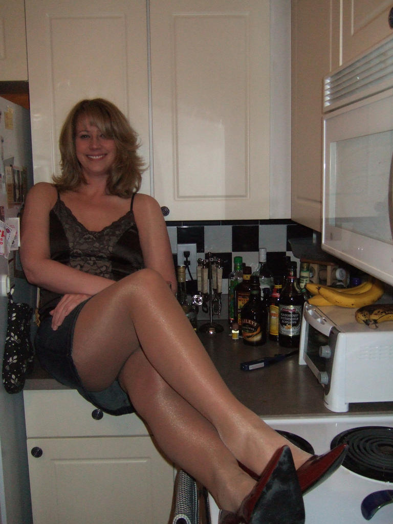 Первое фото покажет тебе милую домашнюю блондинку, которая, расслабляясь вечерком с бутылкой спиртного, упустила из виду свой вульгарный наряд.