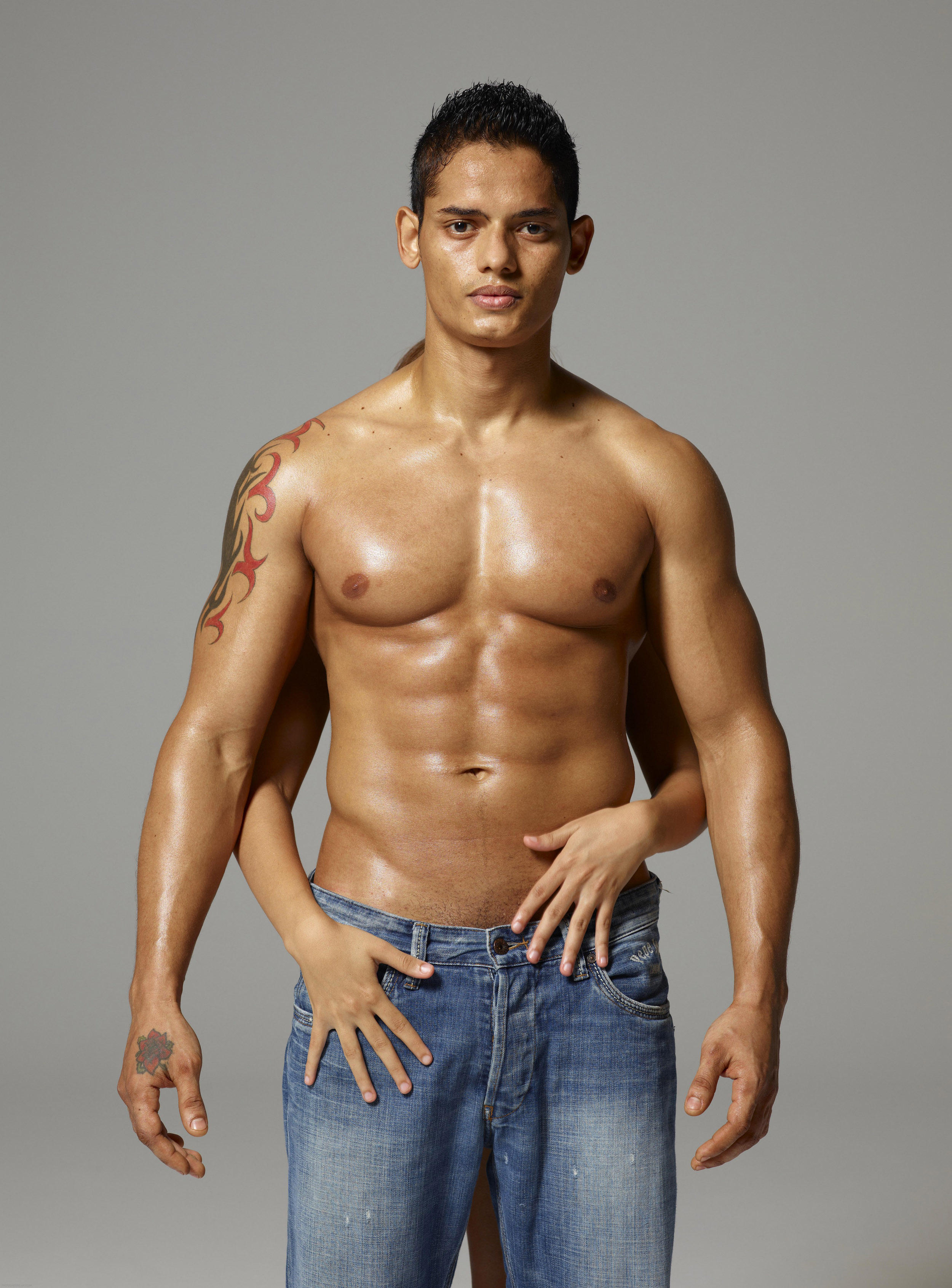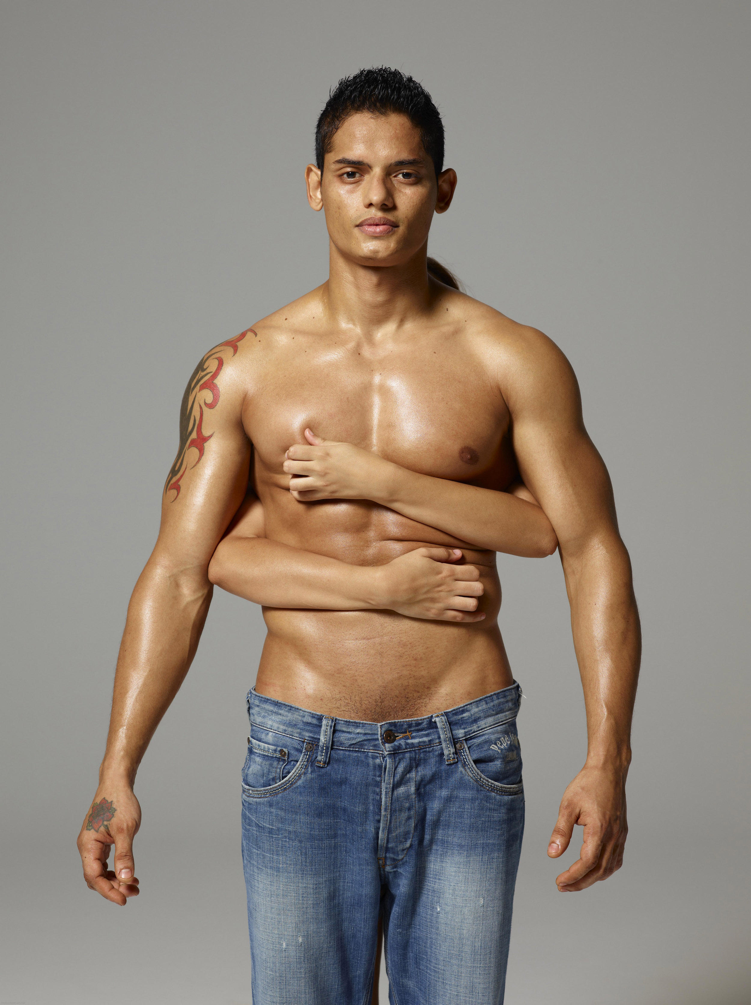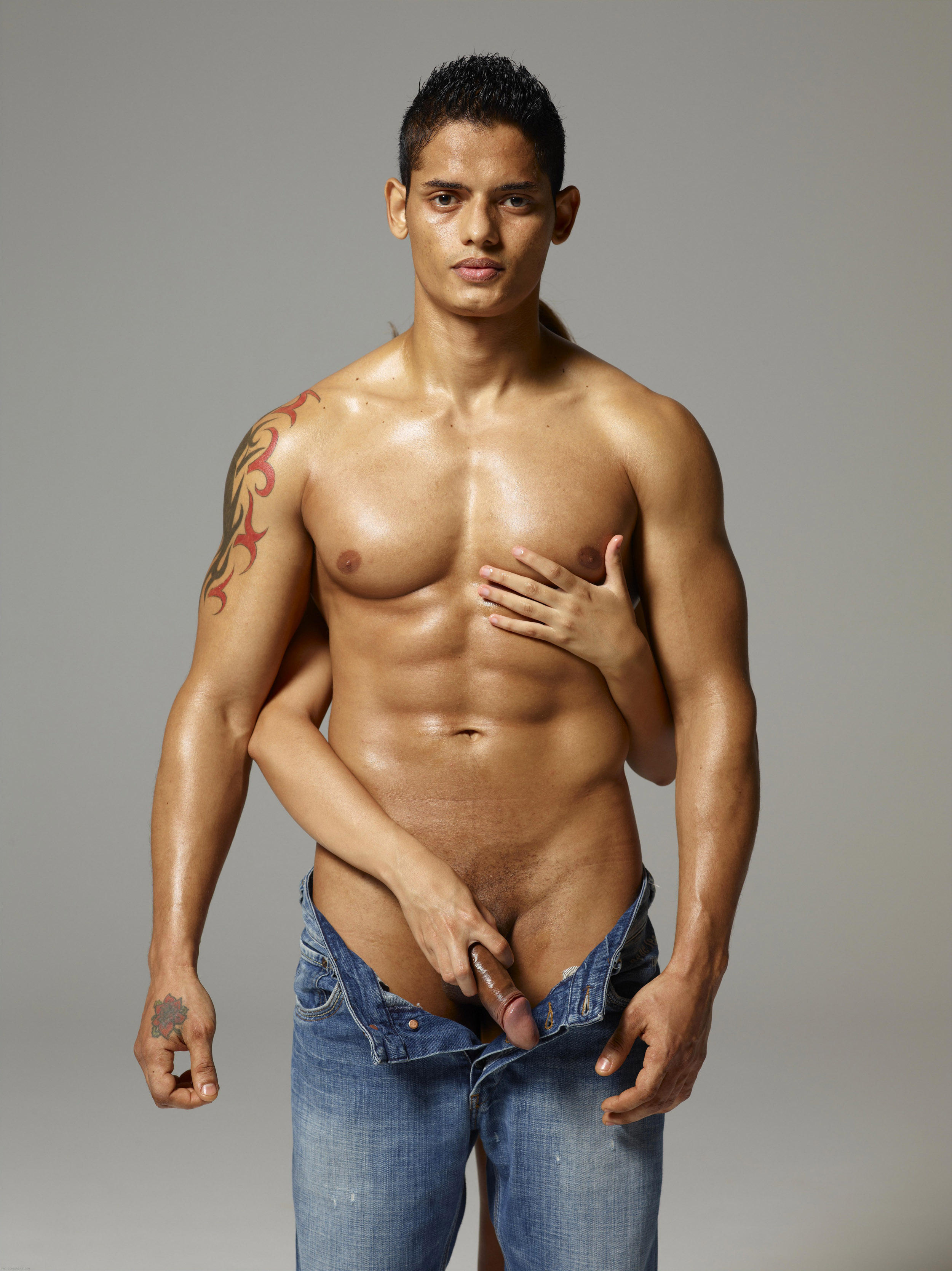 Накаченные бицепсы и твердый, словно каменная глыба, пресс говорят о физической подготовке красавца-брюнета.