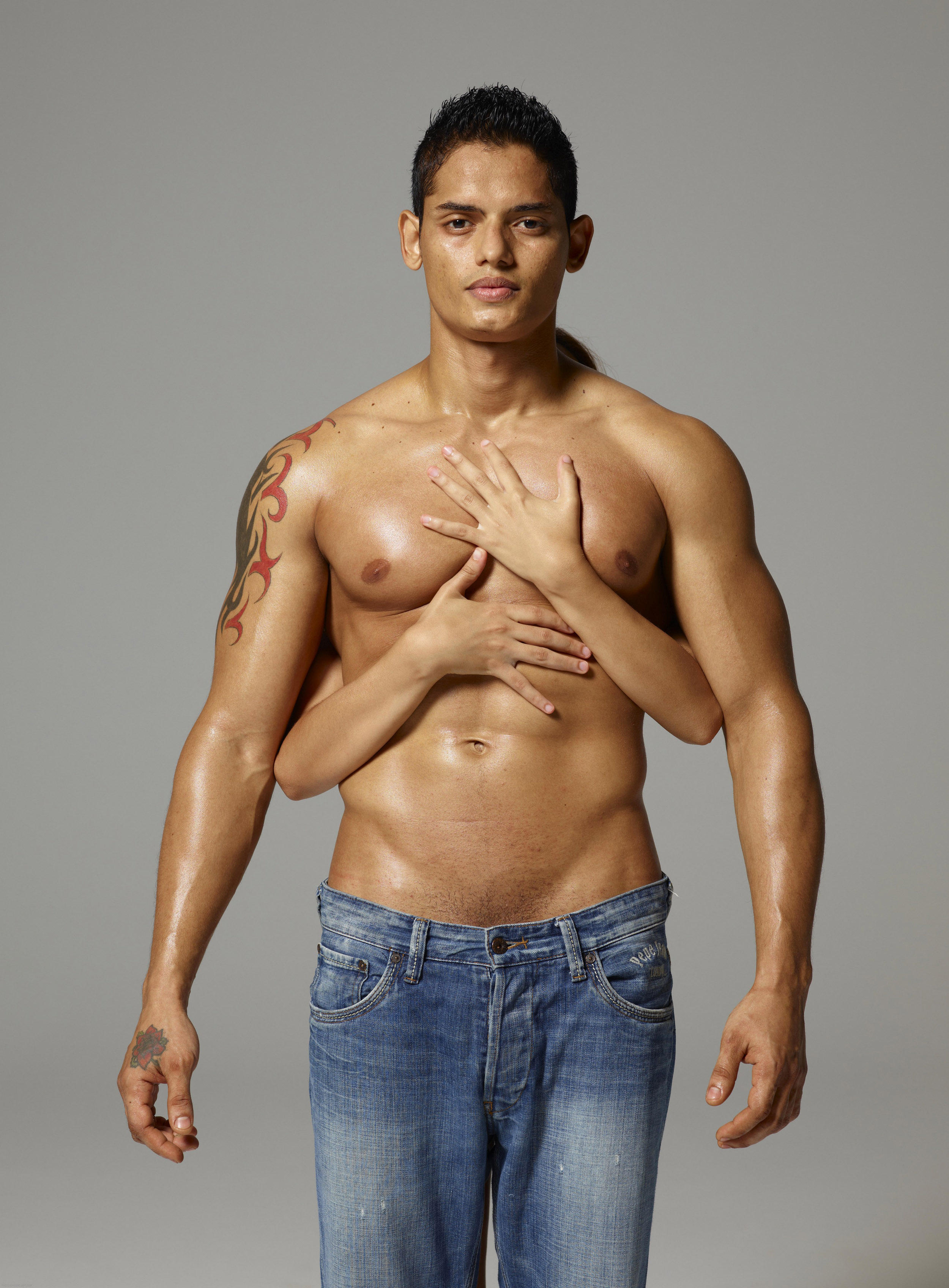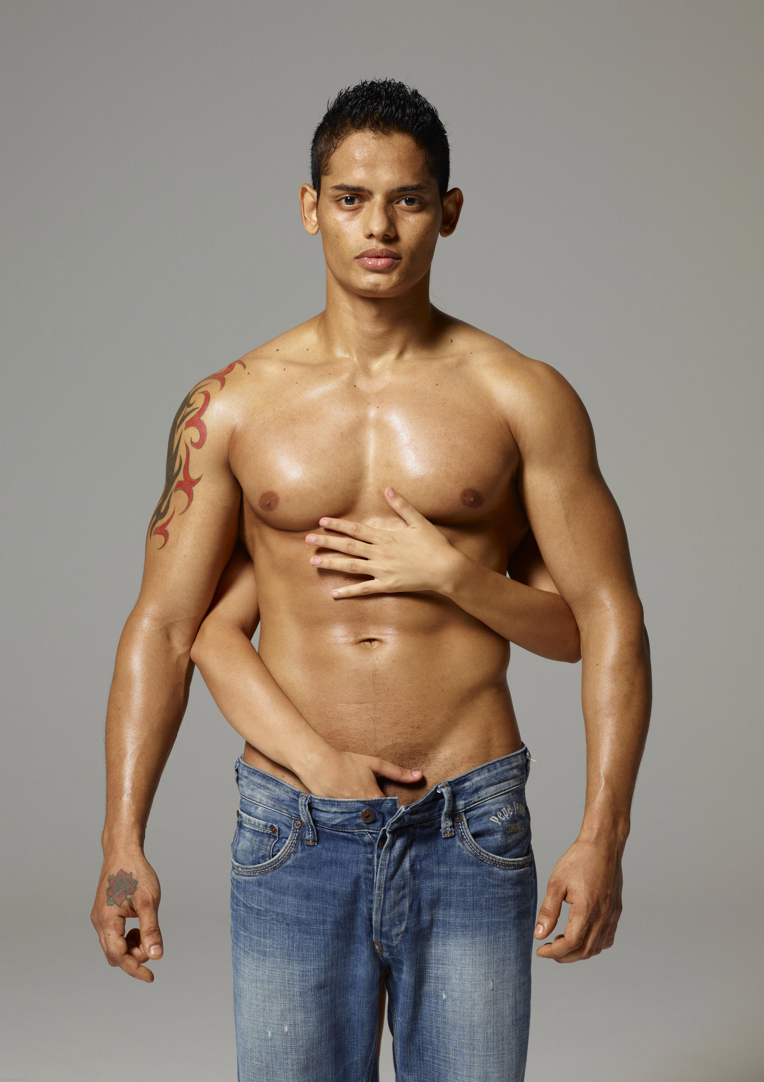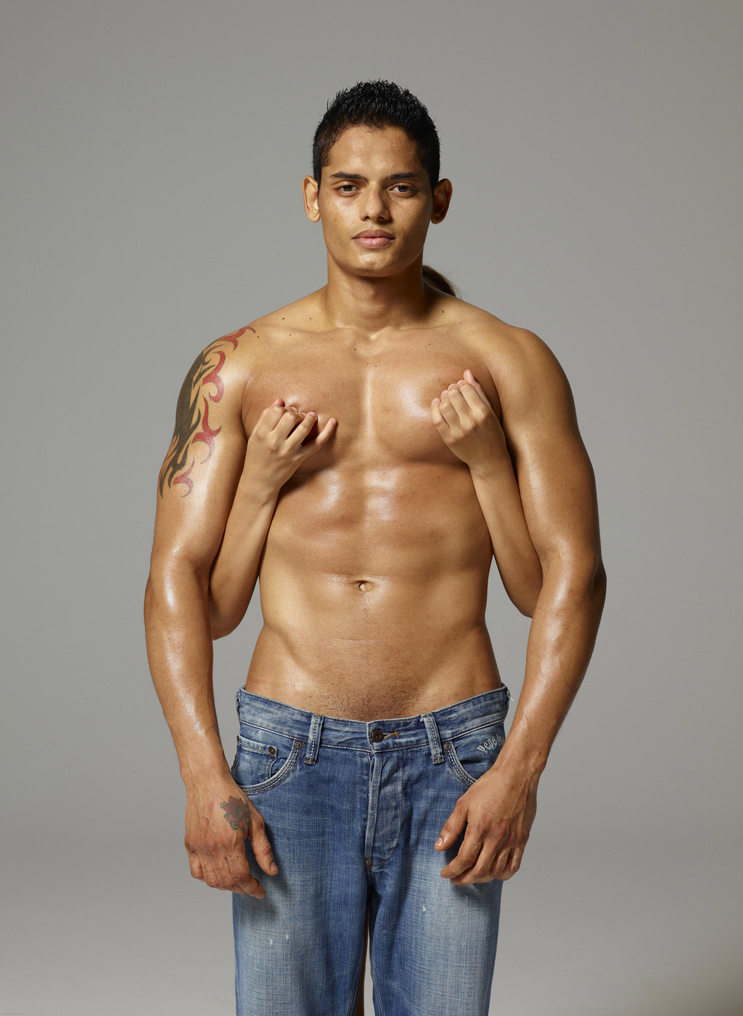 Накаченные бицепсы и твердый, словно каменная глыба, пресс говорят о физической подготовке красавца-брюнета.